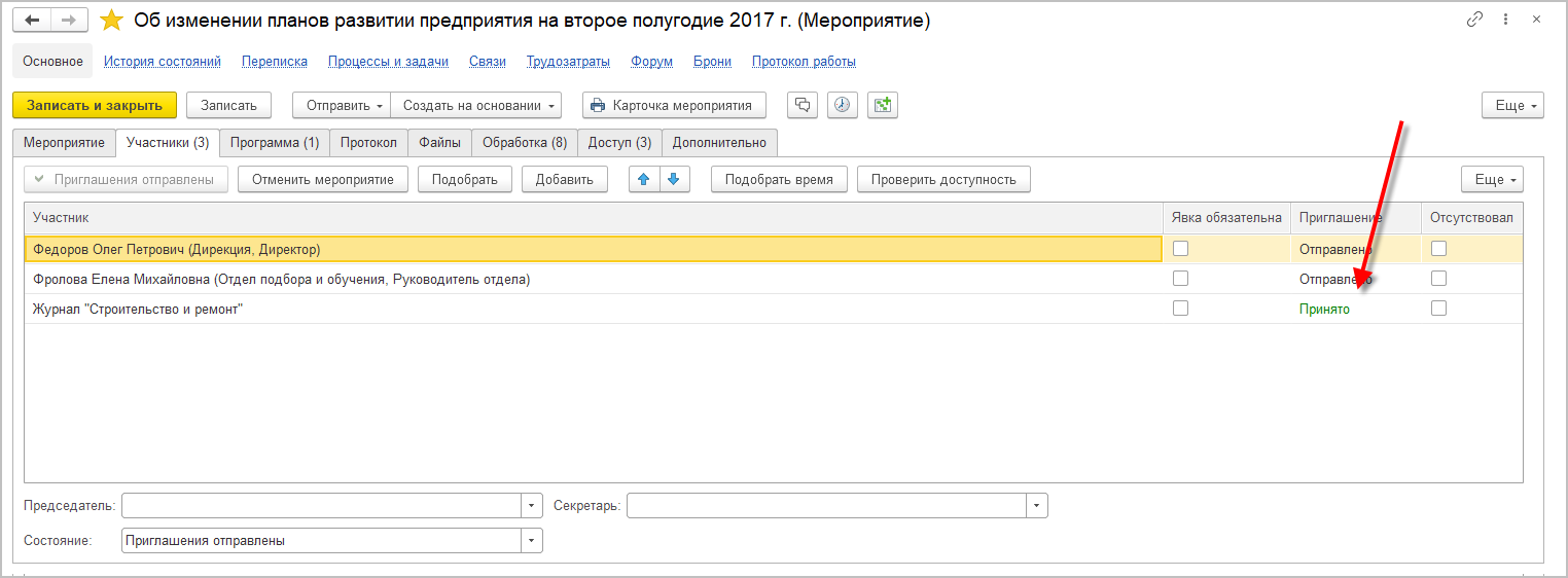 Для участников мероприятия отображается состояние Отправлено. На закладке Участники – Приглашения отправлены.