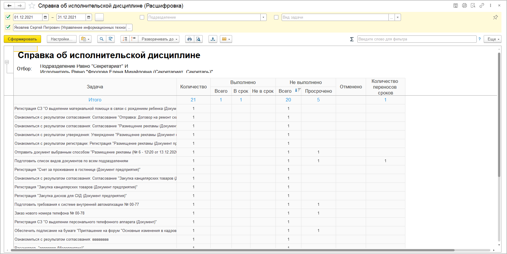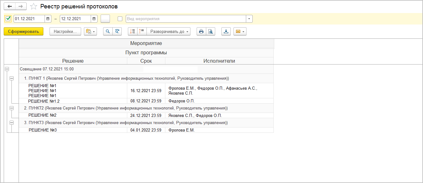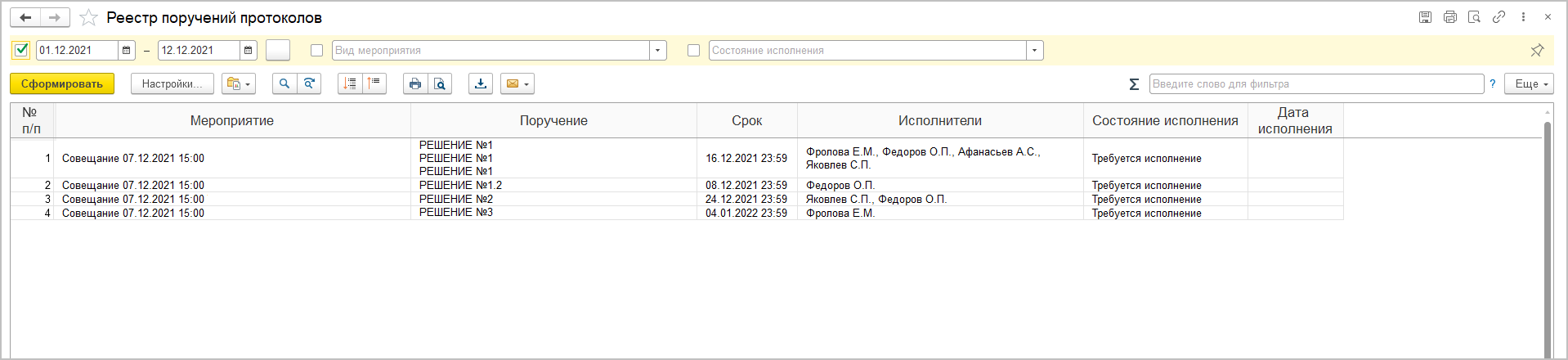 Отчет Реестр поручений протоколов позволяет узнать, как происходит исполнение принятых решений на совещаниях – в какие сроки они должны быть исполнены, кто исполнитель, исполнены ли они и когда были исполнены.