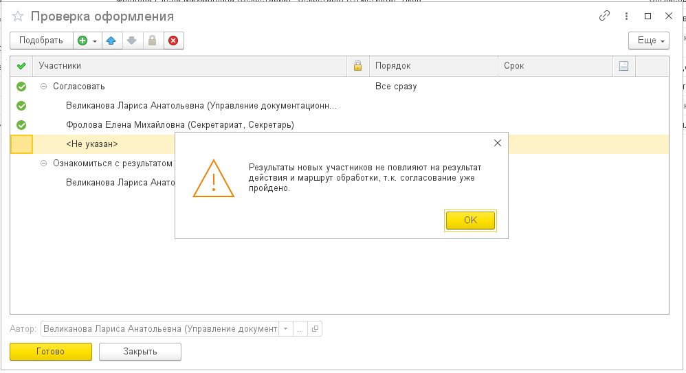 Теперь при попытке добавить, удалить или изменить настройки такой обработки, сотрудник увидит предупреждение.