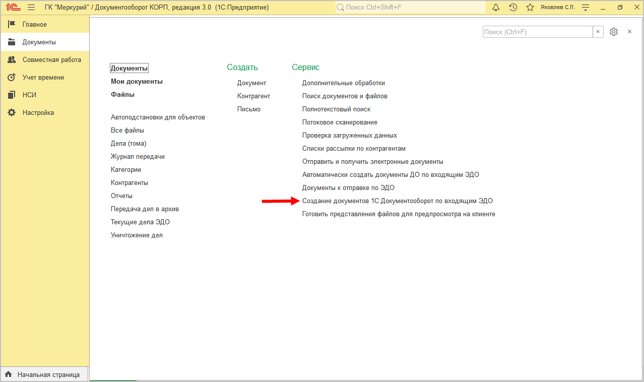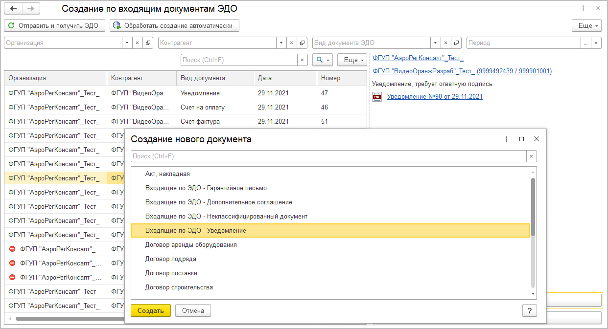 Команда Еще – Обработать создание автоматически запускает процедуру создания документов тех видов ЭДО, для которых в настройках приема указано автоматическое создание.
