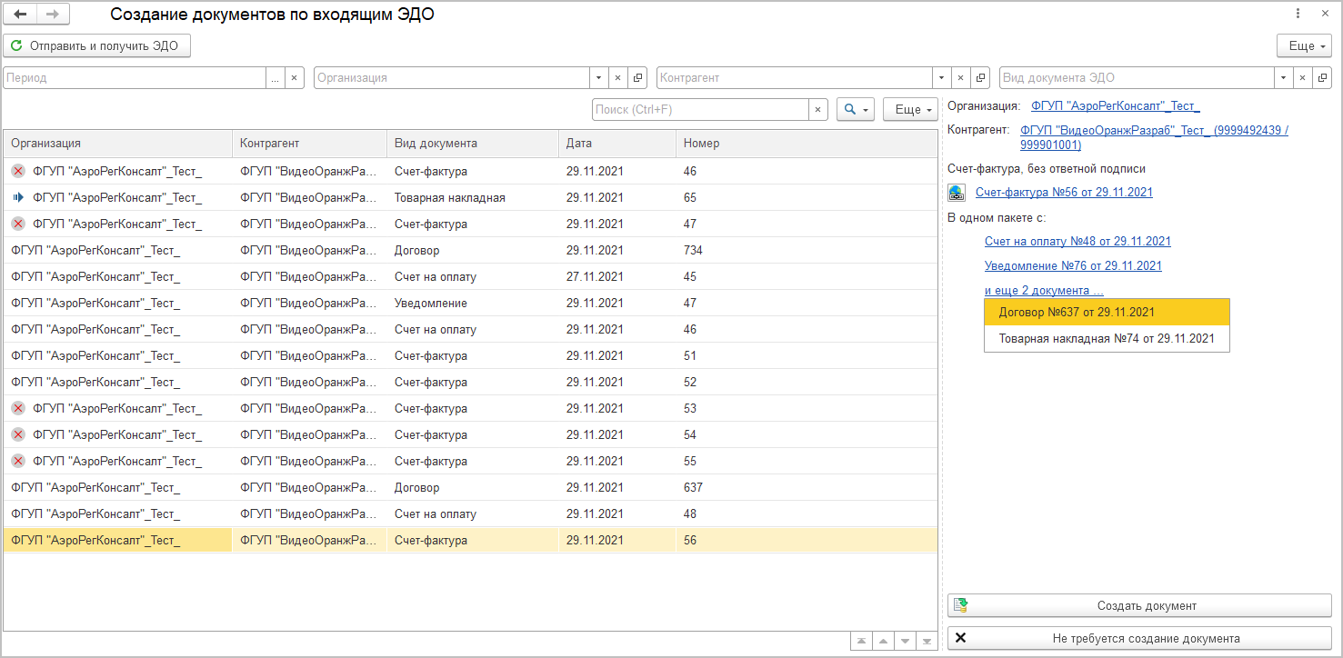 Список входящих ЭДО к созданию документов «1С:Документооборота» выглядит следующим образом.