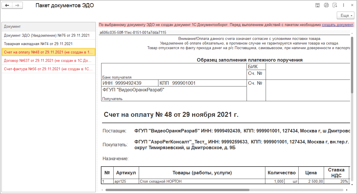 Отображение не созданных в 1С:Документообороте документов в карточке входящего пакета ЭДО. В карточке входящего пакета ЭДО теперь отображаются в том числе и те документы ЭДО, по которым еще не создан документ «1С:Документооборота». При выделении такого документа отображается его предпросмотр, но всплывет предупреждение, что документ «1С:Документооборота» еще не создан с гиперссылкой на создание документа «1С:Документооборота» вручную.