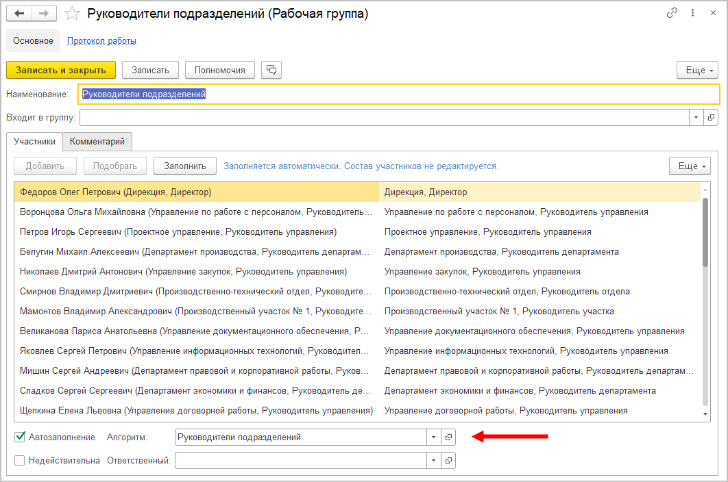 Теперь состав рабочих групп можно обновлять автоматически. Для этого в карточке рабочей группы нужно установить флажок Автозаполнение. При этом блокируется редактирование списка участников.