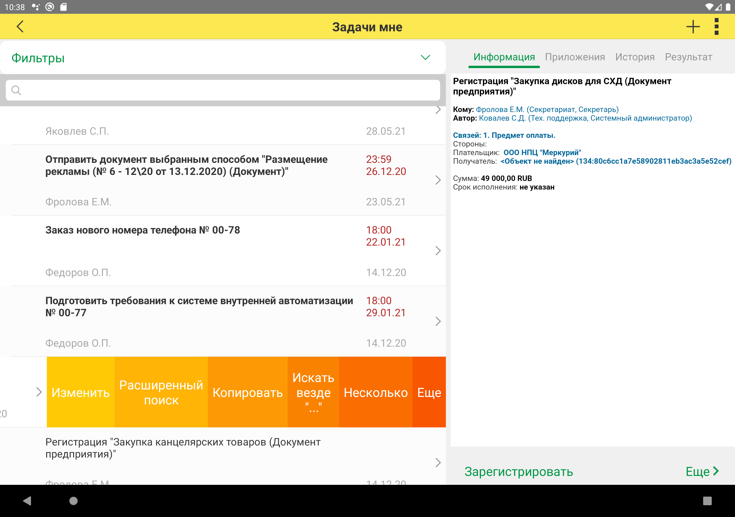 Автоподстановка Исполнители протокола – заполняет исполнителей, названия задач, описание задач и сроки задач для каждого исполнителя протокола мероприятия.