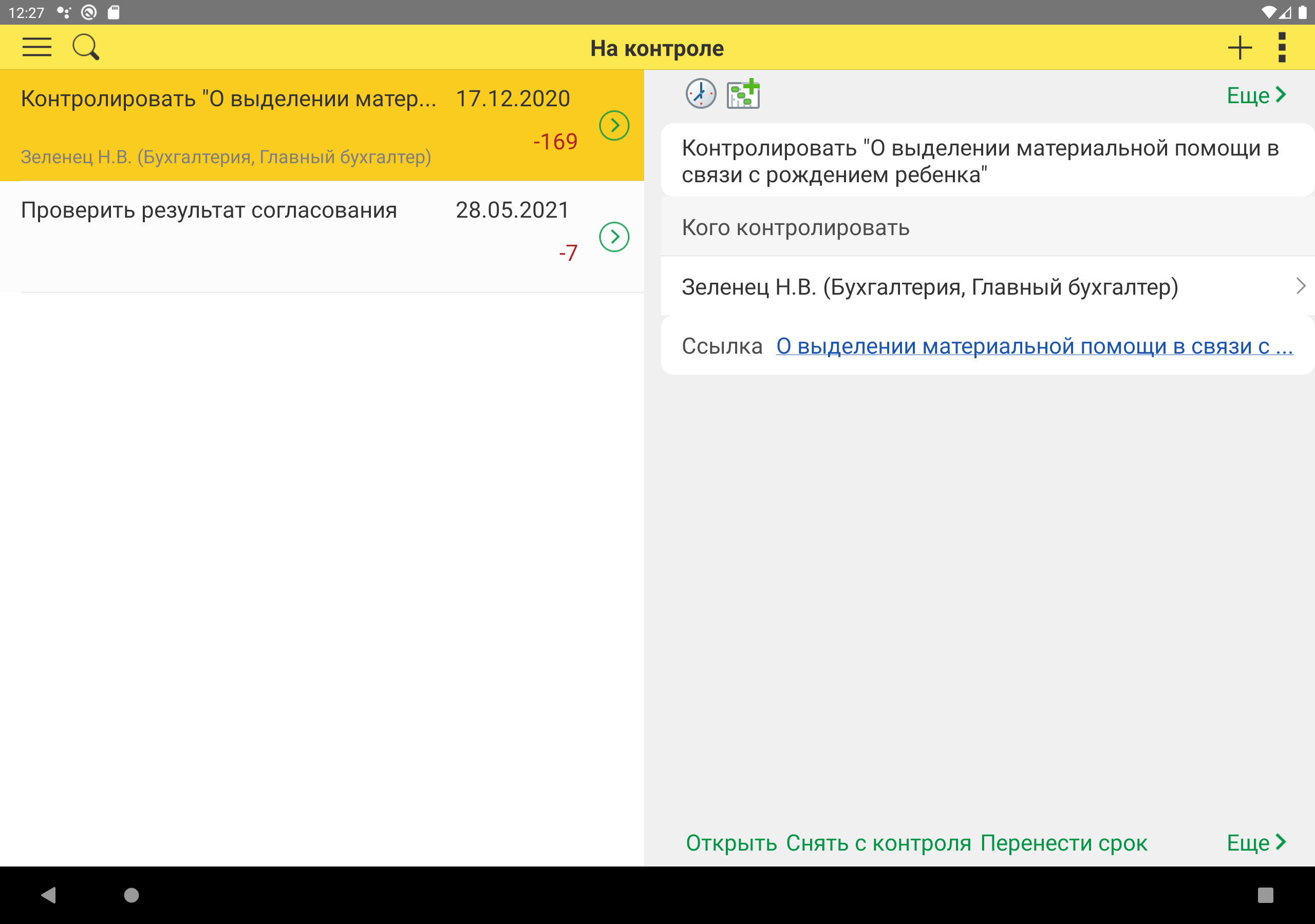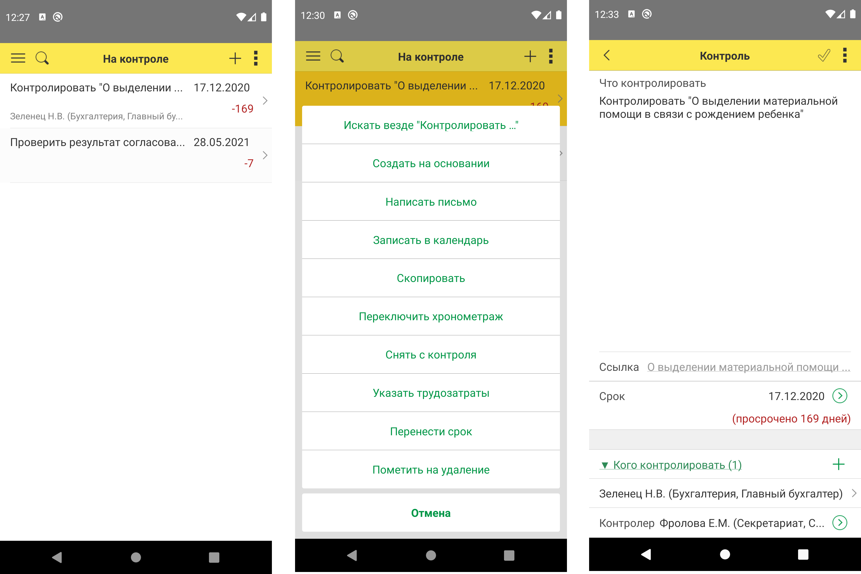 Контроль с подключением хронометража, указанием трудозатрат, созданием записи календаря, переходом к предмету и т.п.: