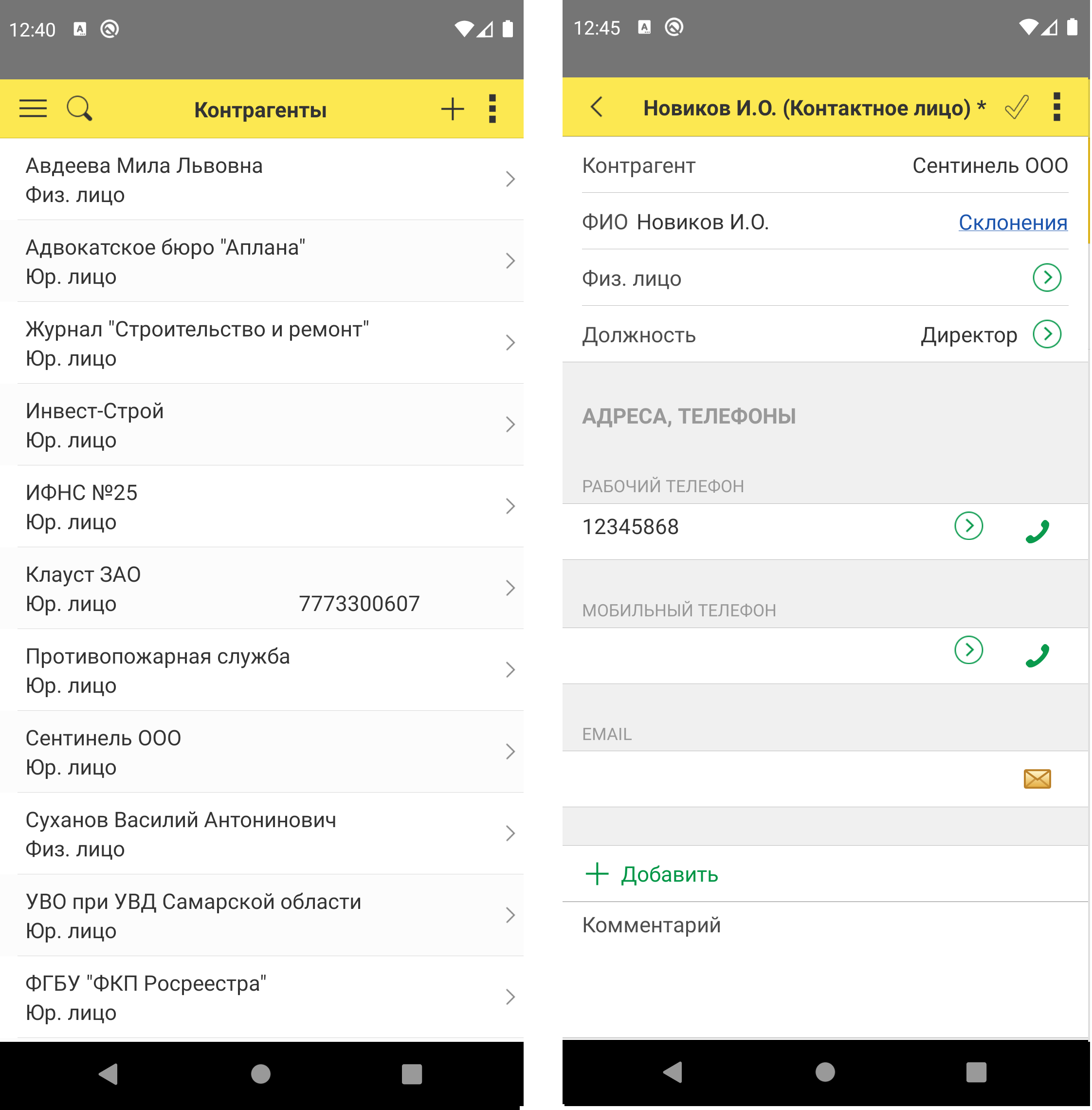 Просмотр и добавление Контрагентов, совершение звонка контактному лицу.