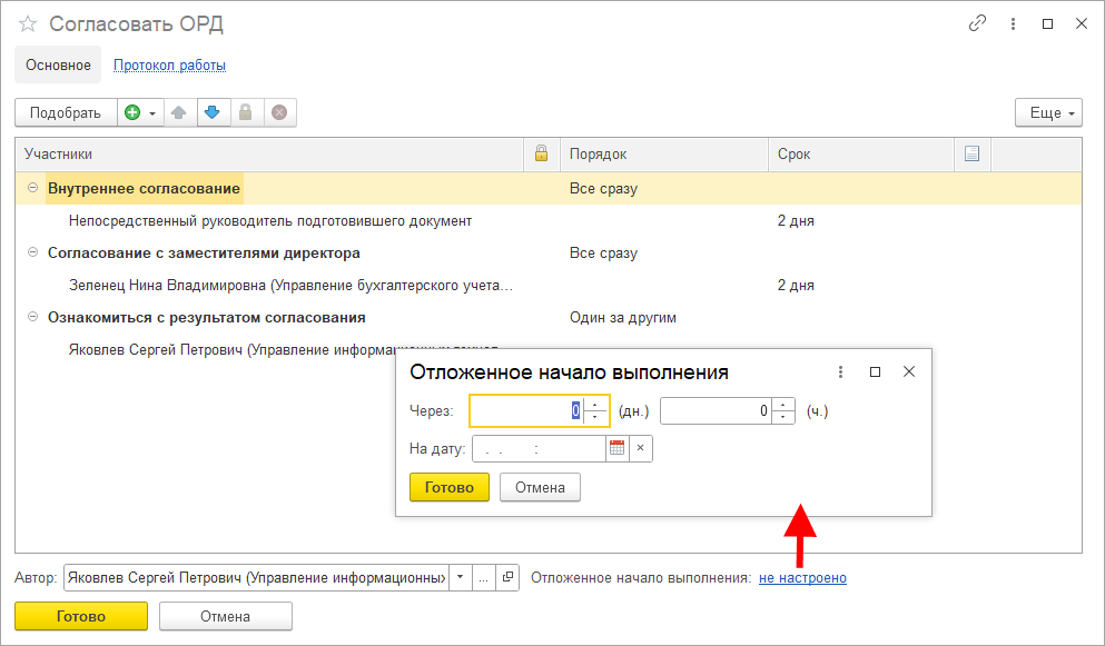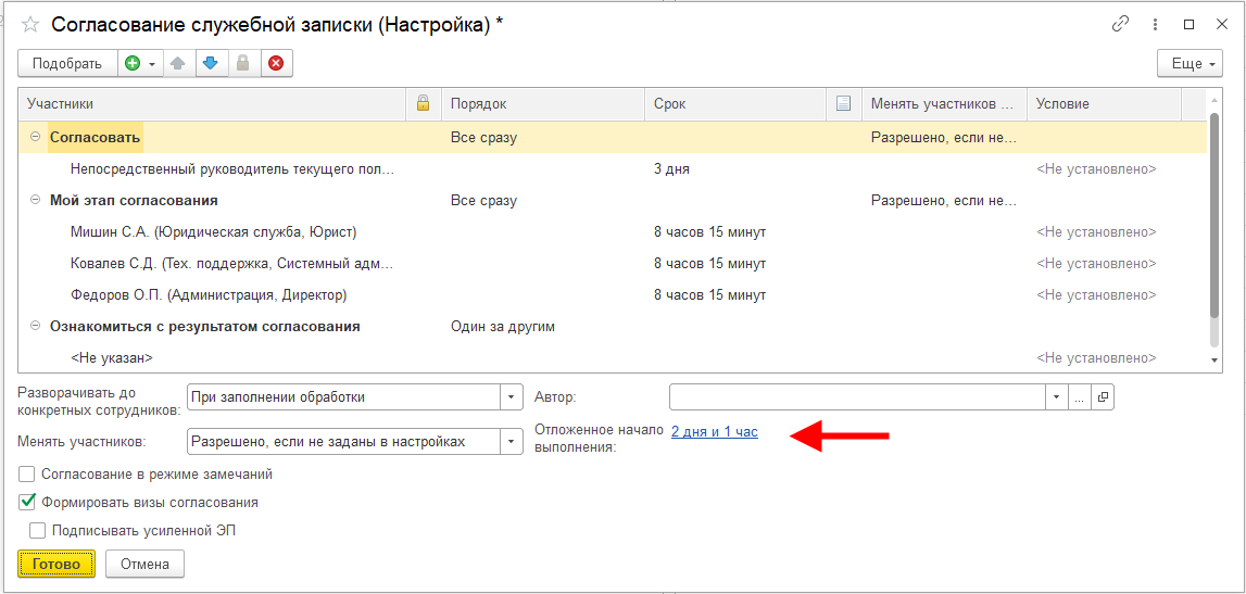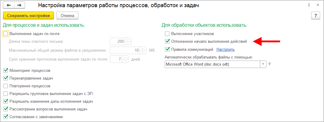 Возможность включается общей настройкой Отложенное начало выполнения действий. По умолчанию она установлена.