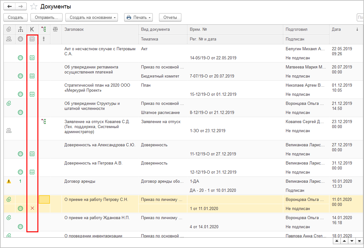 В новой версии программы уничтоженные и переданные в архив документы отображаются особым образом в списках и карточках.
