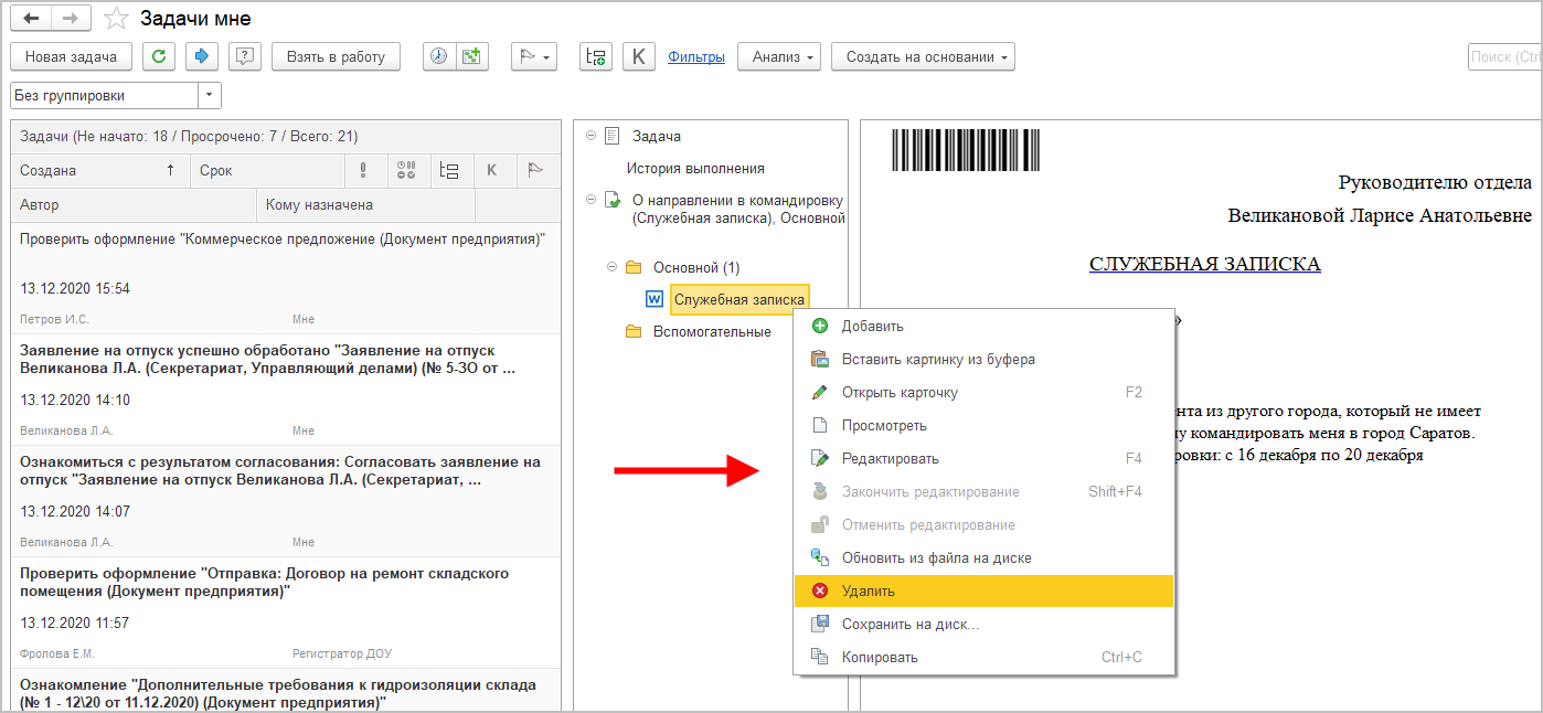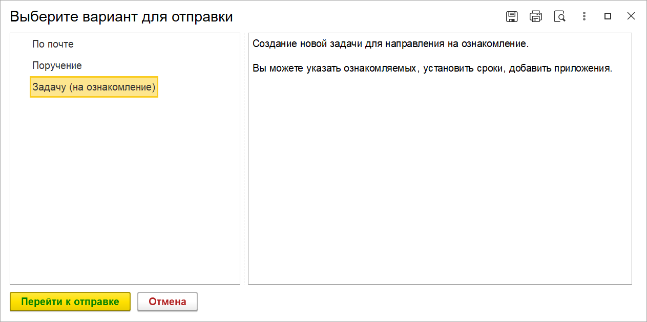 Также для создания задач вне обработки в карточке документа и мероприятия предусмотрена команда Отправить – Задача (на ознакомление).
