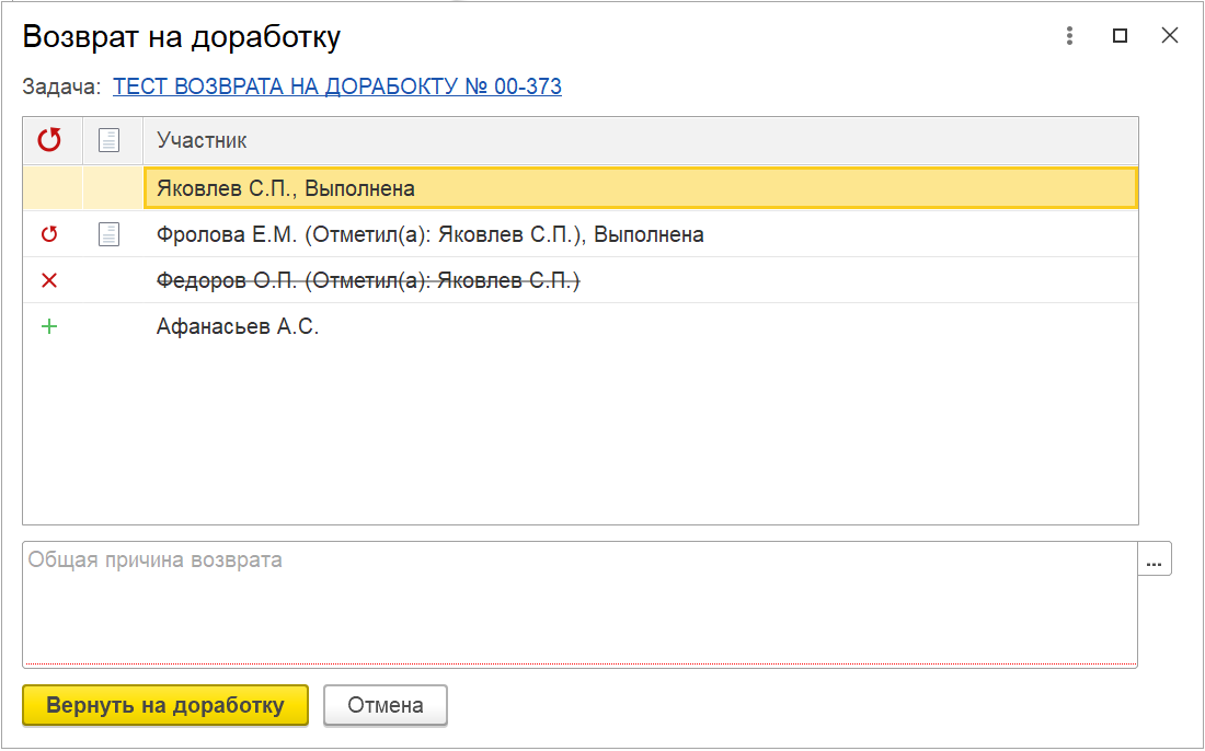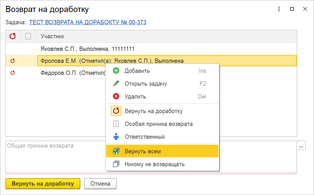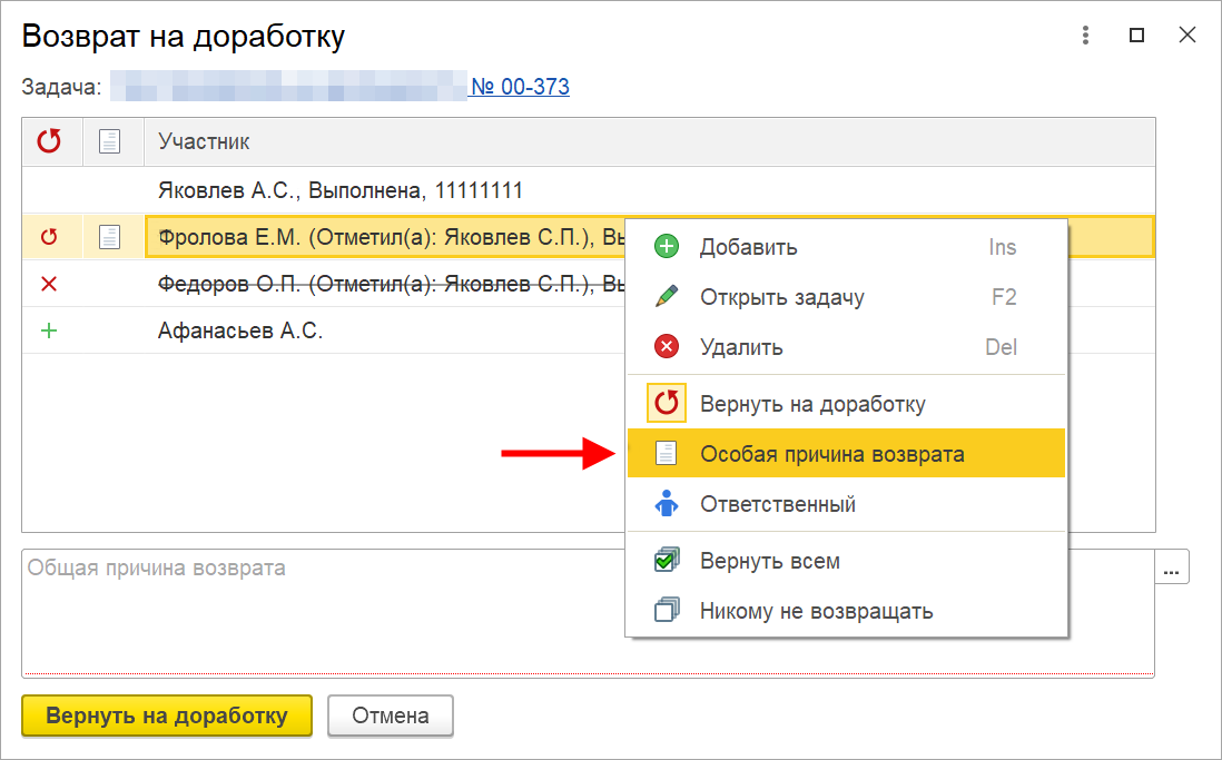 В окне Возврат на доработку можно указать Общую причину возврата для всех исполнителей и дополнительно ввести Особую причину возврата для каждого.
