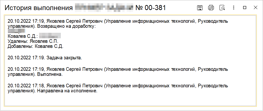 В истории выполнения задачи возврат на доработку будет выглядеть следующим образом: