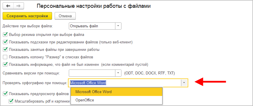 В новой версии программы проверка орфографии в письмах встроенной почты, карточках документов и шаблонах текста доступна не только с помощью MS Office, но и через OpenOffice. Возможность доступна только в тонком клиенте под управлением MS Windows.