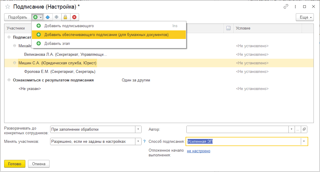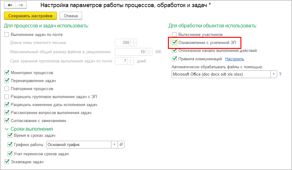 Если необходима Усиленная ЭП, то в Настройках программы – Процессы, обработки, задачи требуется установить настройку Ознакомление с усиленной ЭП.