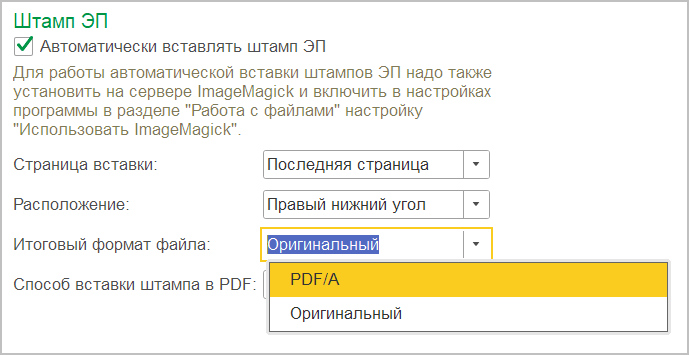 Если в настройках в качестве итогового формата штампа выбран PDF/А, то файл xls или xlsx со штампом будет подготовлен в формате PDF.