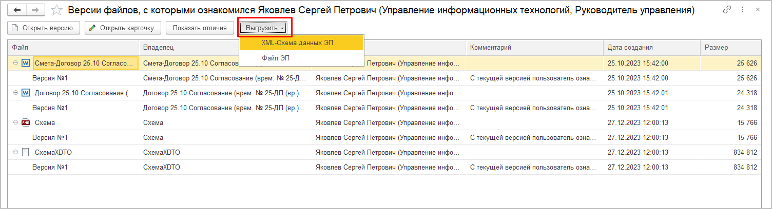 Если настройка установлена, в карточке действия Ознакомление появится флажок Подписывать усиленной ЭП. При попытке ознакомиться с действием, где эта настройка включена, будет требоваться ЭП. Также в окне сравнения версий для ознакомлений с усиленной ЭП отобразится подменю Выгрузить, с помощью которого можно выгрузить XML-схему подписи и файл ЭП.
