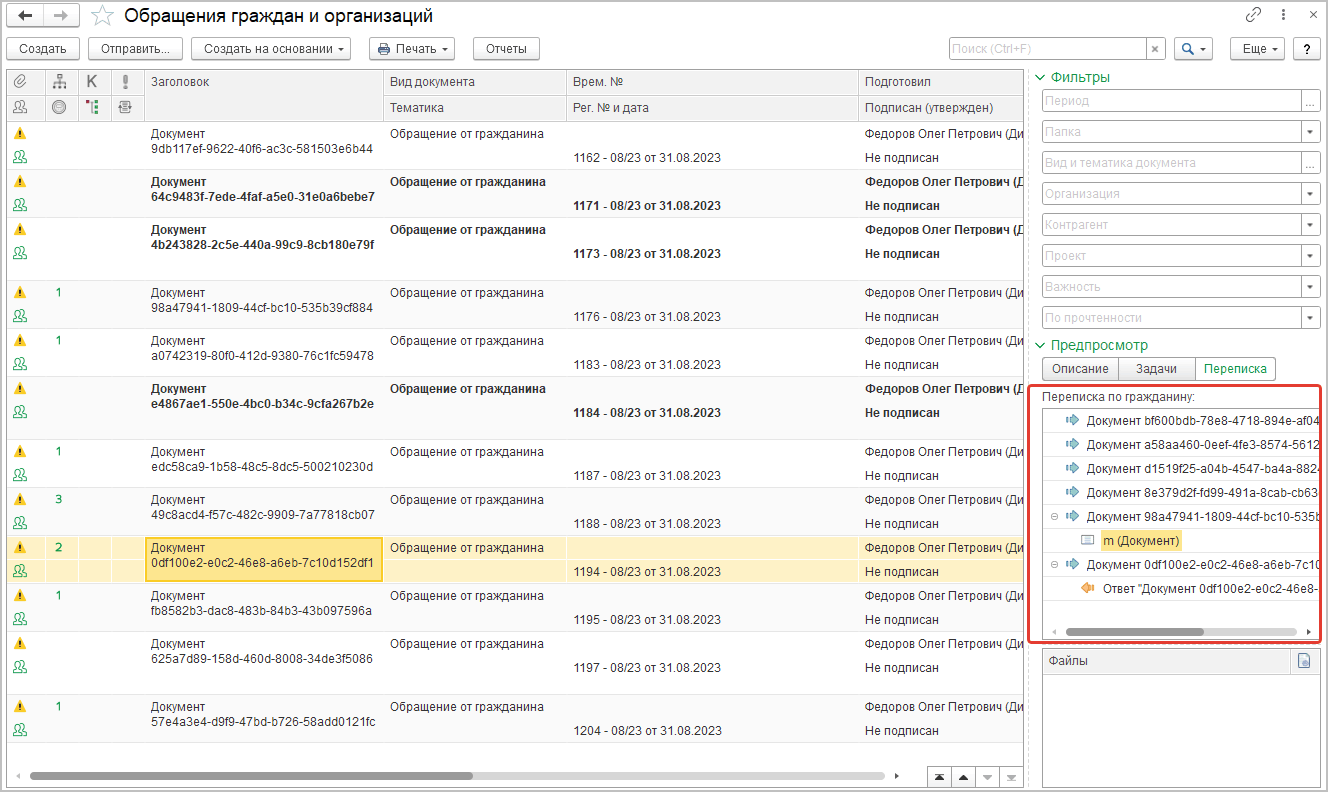 ■ отображается новая закладка Переписка, где видны ответные документы по одному выделенному в списке обращению.