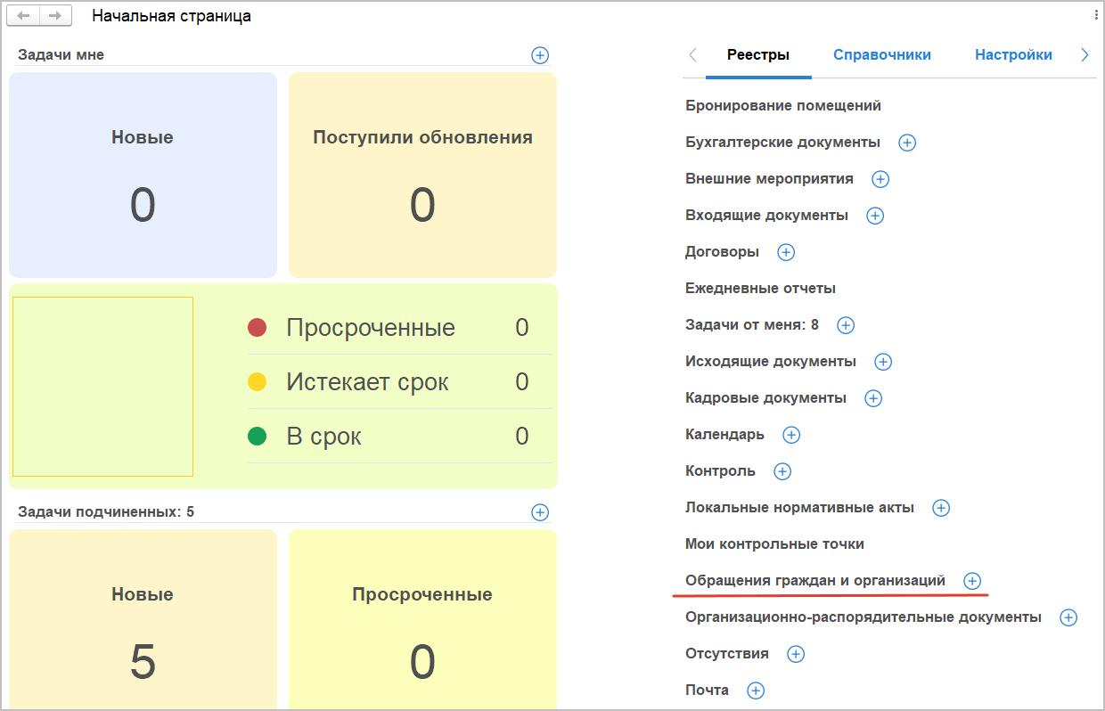В списке Реестры на рабочем столе сотрудника и руководителя в случае, если включен учет обращений, отображается команда открытия списка обращений или создания нового обращения.