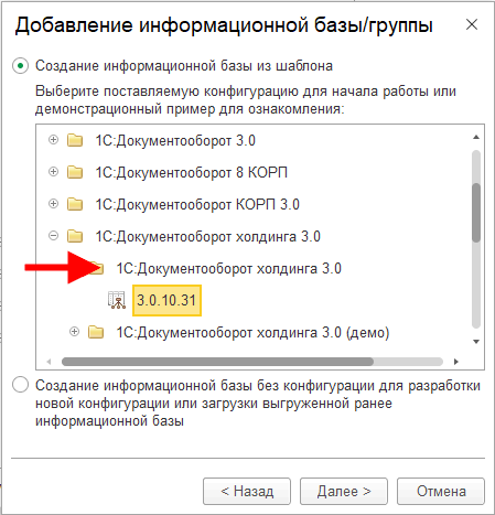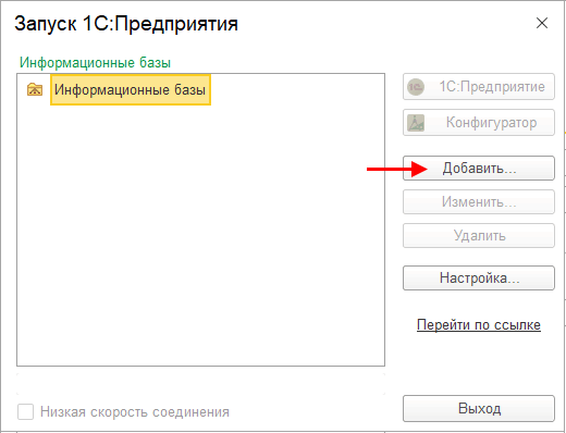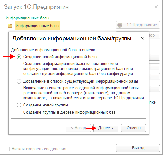 1. При первом запуске базы автоматически откроется помощник, в котором необходимо выбрать вариант Центральный узел или самостоятельная установка.