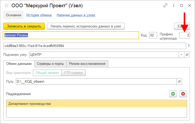 4. В списке Узлы обмена данными (Настройка – Контролируемый обмен данными) открыть карточку элемента Этот узел, соответствующую текущему узлу – он выделен жирным шрифтом. Присвоить «говорящее» наименование и произвольный код (например, «Центральный узел» и «00»).