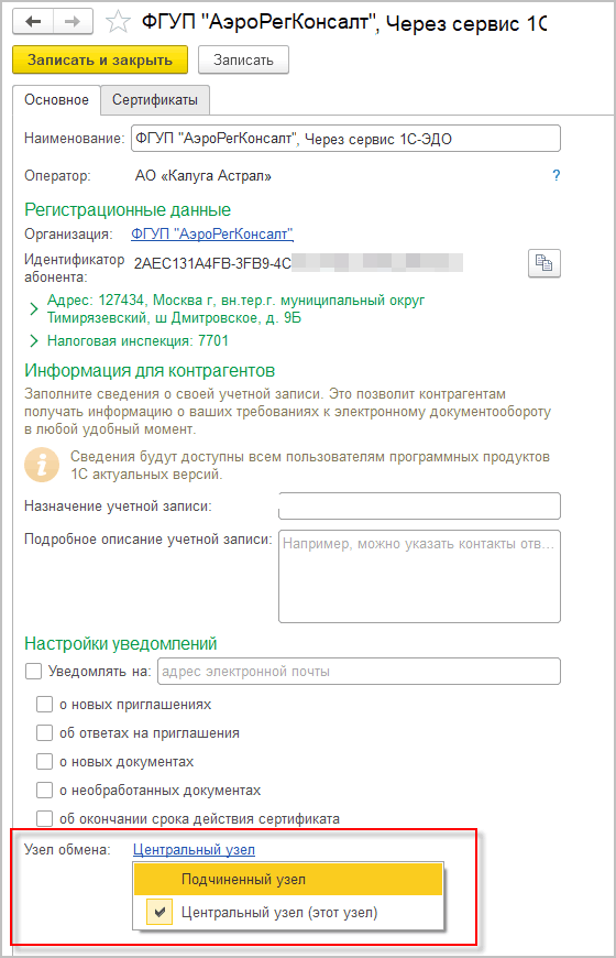 4.3.1. Порядок настройки в информационной базе центрального узла