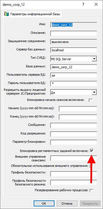 2. Не заблокированы ли регламентные задания (Консоль администратора –Информационная база – Свойства).