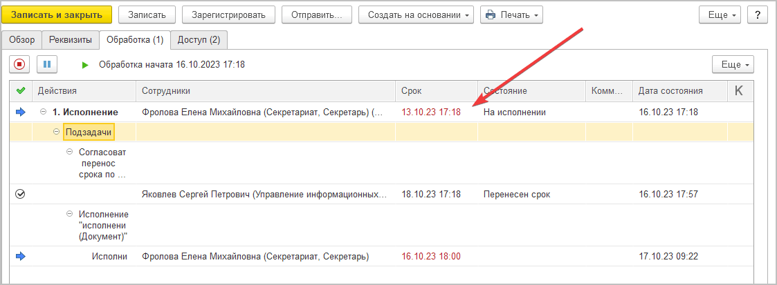 ■ Теперь на закладке Обработка для документов и мероприятий просроченные задачи выделяются красным цветом.