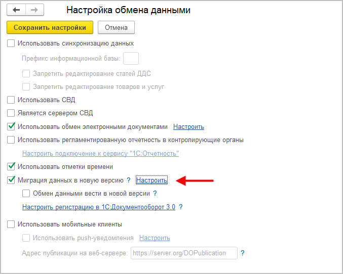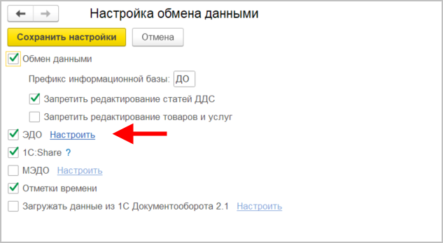 Чтобы включить возможность обмена по ЭДО, необходимо установить флажок ЭДО в разделе Настройка – Настройка программы – Обмен данными.
