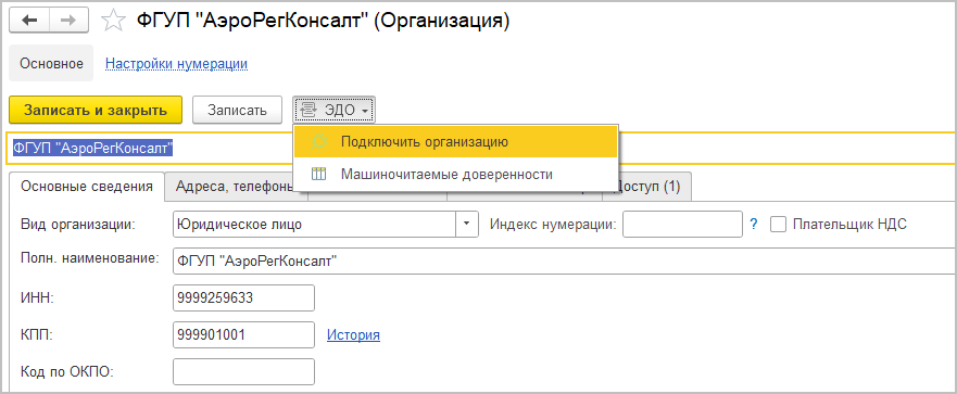 Для обмена ЭДО с контрагентами необходимо создать учетную запись ЭДО для организации. Сделать это может пользователь с полномочиями Ответственные за ЭДО и МЧД.