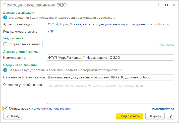 После указания данных и согласия с условиями использования пользователю программа предложит ЭП регистрационные данные организации. После этого организация получит учетную запись ЭДО и будет допущена к обмену с контрагентами.