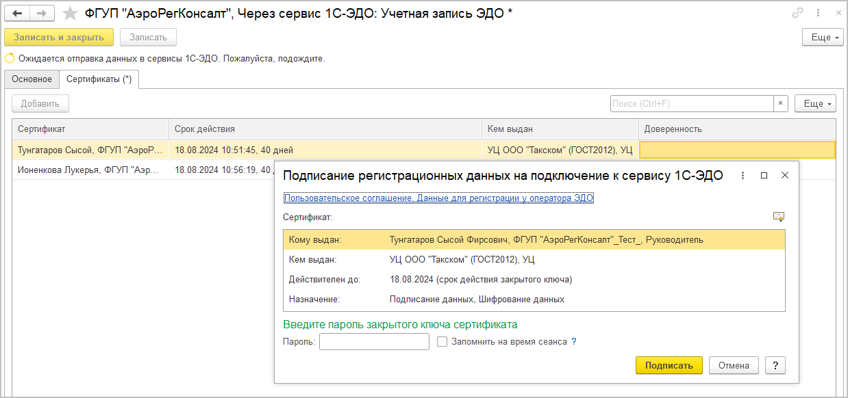 3. Добавить свой сертификат сотрудника. При записи учетной записи программа предложит подписать новые регистрационные данные у оператора ЭДО.