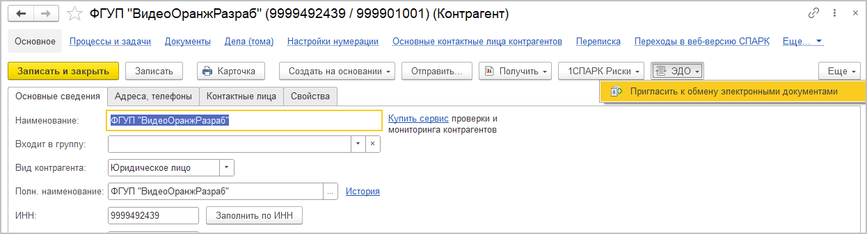 Для отправки контрагенту приглашения к обмену ЭДО необходимо открыть карточку контрагента и выполнить команду ЭДО – Пригласить к обмену электронными документами.