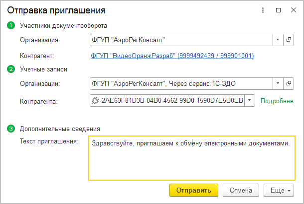 В открывшемся окне необходимо указать вашу организацию, которая будет обмениваться с контрагентом по ЭДО, учетные записи ЭДО вашу и контрагента, а также ввести текст приглашения к ЭДО.
