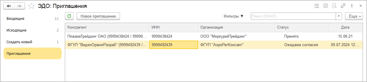 После этого отправленное приглашение будет отображаться в разделе Документы – Текущие дела ЭДО на закладке Приглашения. Для просмотра необходимы права на ЭДО.