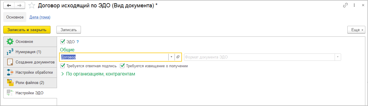 ■ Настройки отправки по ЭДО перенесены в карточку вида документа 1С:Документооборота, теперь можно указать общие настройки для всех организаций и контрагентов по умолчанию.