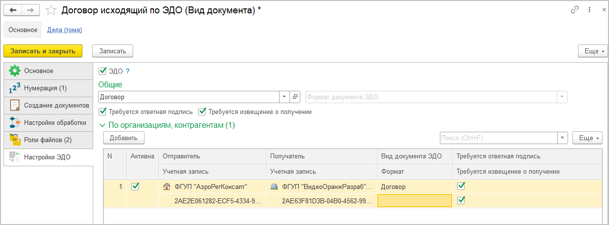 Настройки выполняются в карточке вида документа на закладке Настройки ЭДО. Необходимо указать возможность отправки по ЭДО документов данного вида и вид документа ЭДО, которому будет соответствовать вид документа 1С:Документооборота.