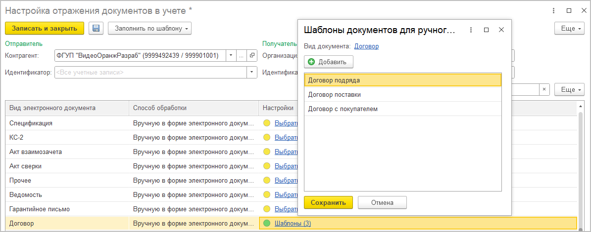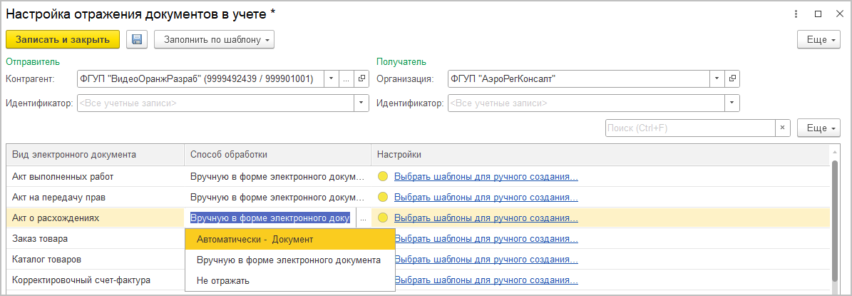 Настройки получения документов устанавливаются в карточке контрагента по команде ЭДО – Настройки отражения в учете. Для конкретной пары Организация - Контрагент настраивается способ создания документов 1С:Документоборота по видам документов ЭДО: вручную в карточке документа ЭДО или автоматически по заранее настроенным правилам.
