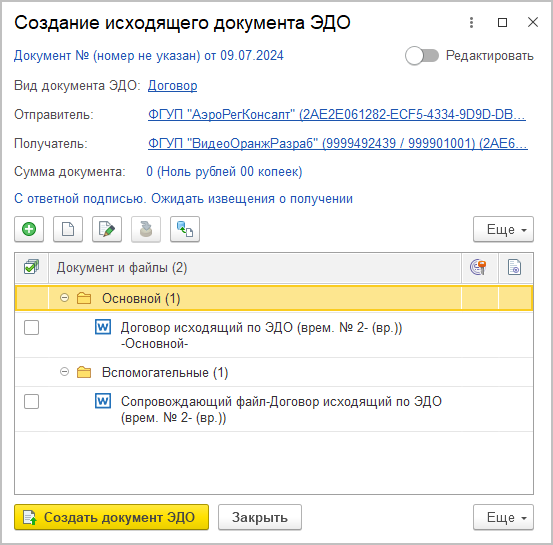 При выполнении данной команды, если не удалось определить все параметры создания исходящего ЭДО, откроется окно ввода параметров документа.