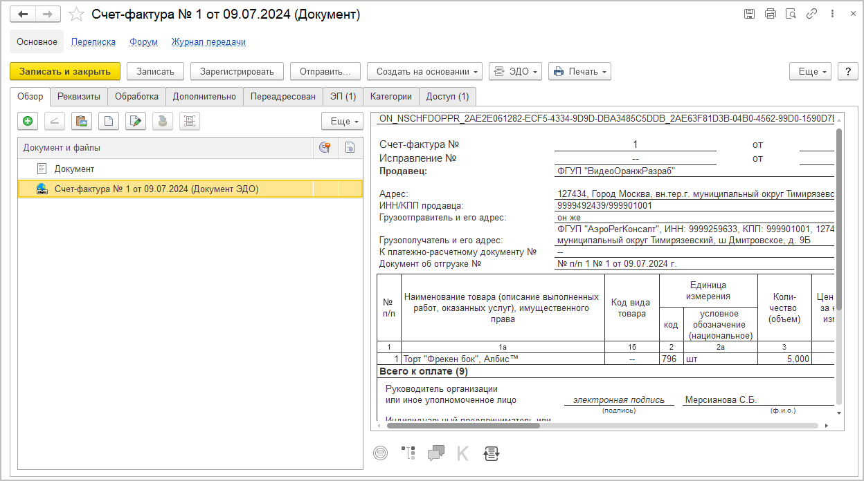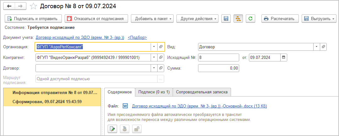 После создания откроется карточка нового документа ЭДО, который можно подписать ЭП и отправить.