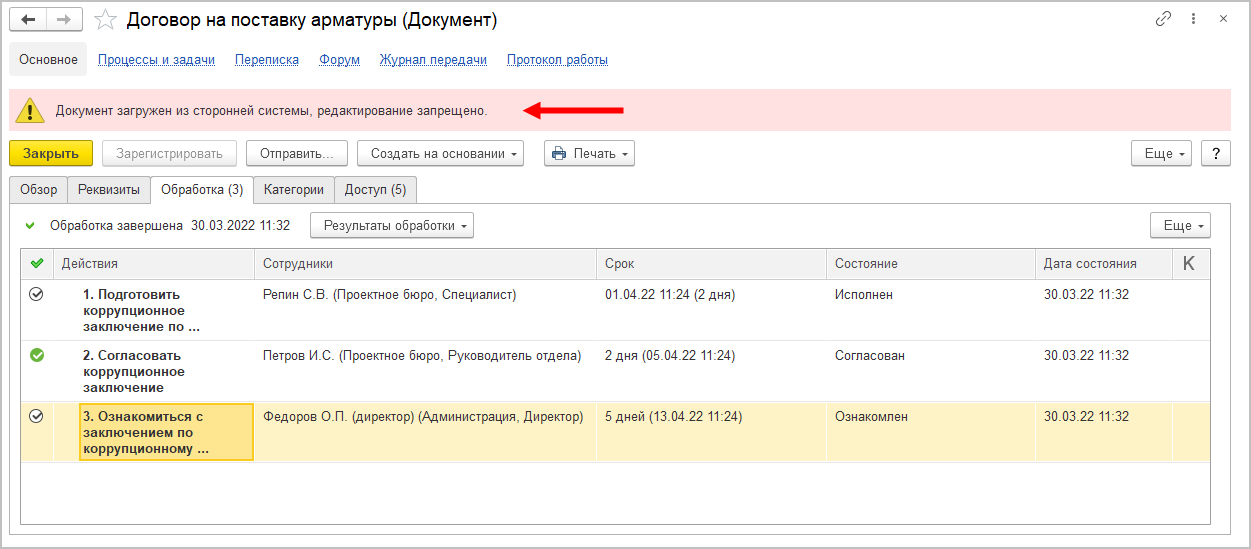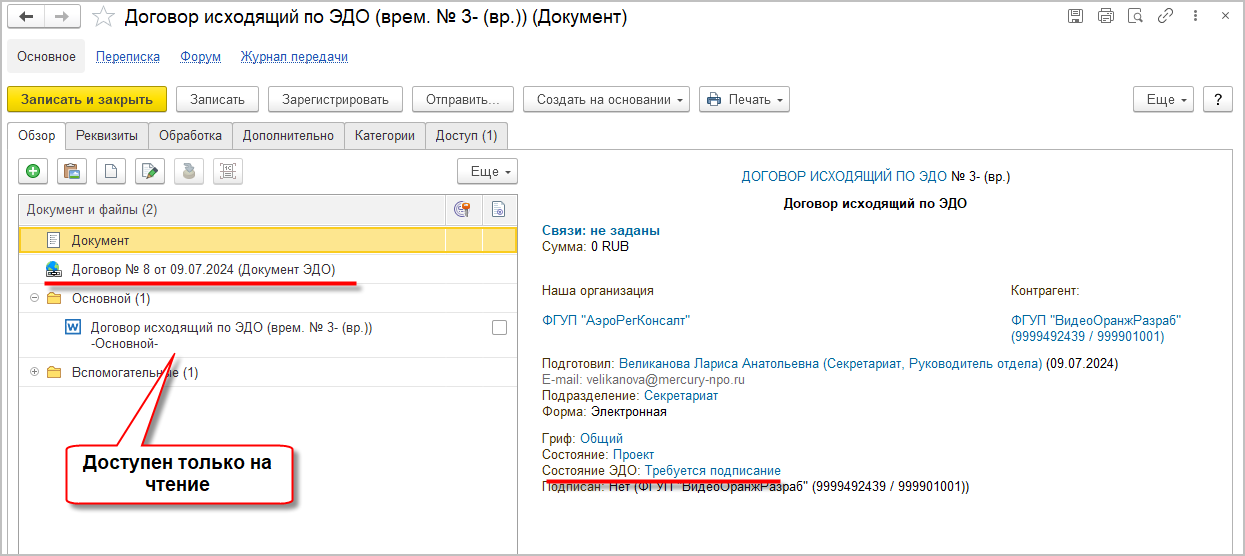 После создания исходящего ЭДО в карточке документа 1С:Документооборота в списке файлов появится связанный документ ЭДО. При этом файл, отправленный по ЭДО, будет недоступен для редактирования, фактически будет представлять собой оригинал проекта документа ЭДО.