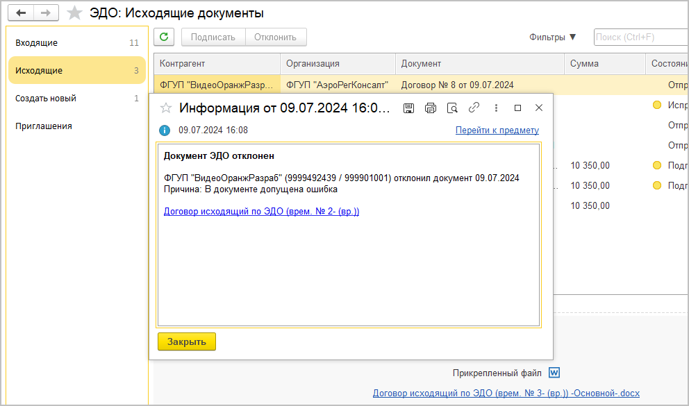 Если исходящий документ ЭДО отклонен контрагентом, то ответственному за документ 1С:Документооборота придет соответствующее уведомление.