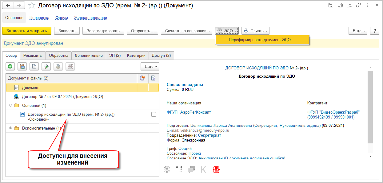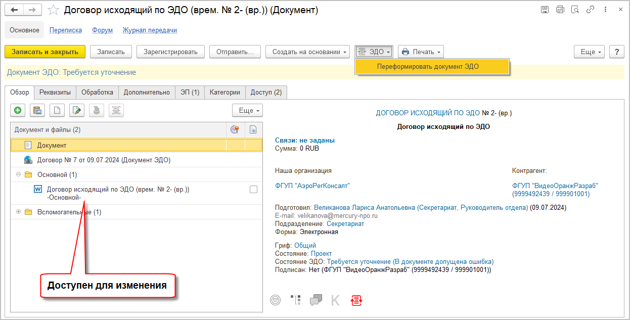 В отклоненном документе отправленный файл станет доступен для редактирования. После изменения файла можно создать новую версию отклоненного документа с помощью команды ЭДО – Переформировать документ ЭДО.