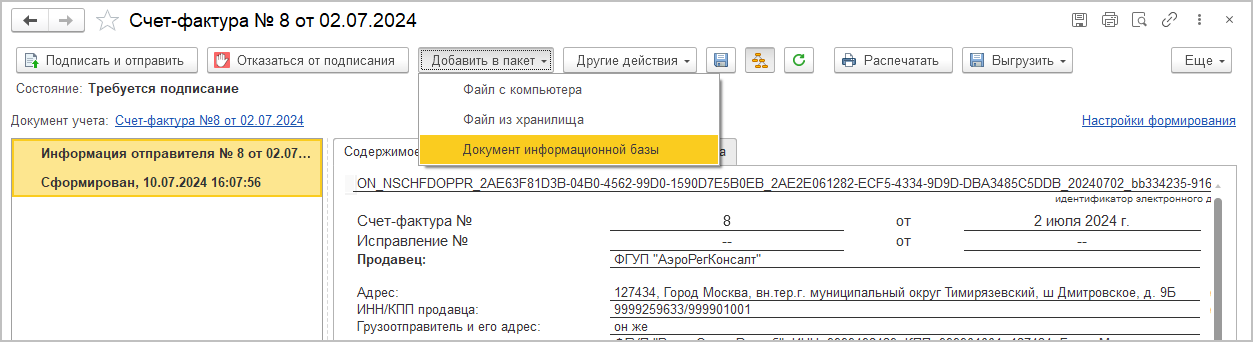 Если необходимо отправить несколько документов в одном пакете ЭДО, то необходимо после создания исходящего документа ЭДО выбрать в меню Добавить в пакет – Документ информационной базы.