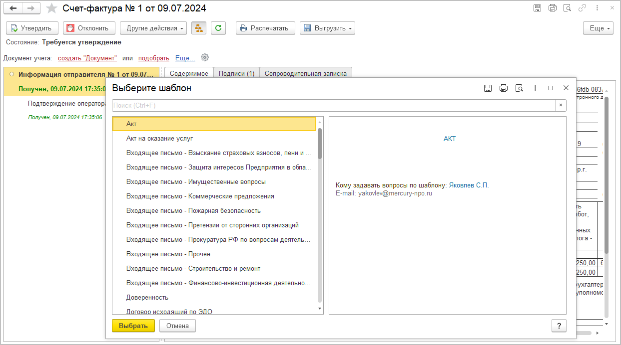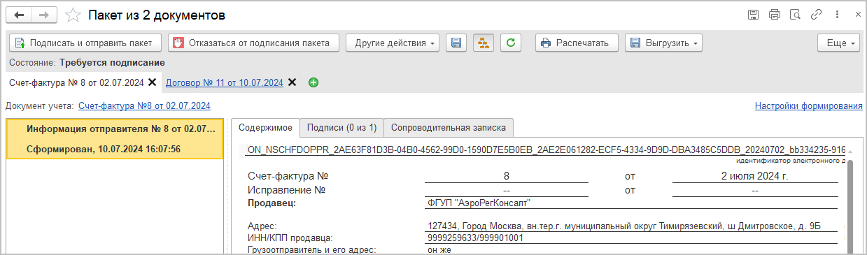 После выполнения данной команды программа предложит подобрать документ 1С:Документооборота для добавления в пакет. После выбора документа образуется пакет ЭДО, который можно подписать и отправить контрагенту.