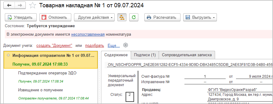 Если во входящем формализованном документе ЭДО со списком товаров есть неизвестная номенклатура, то в карточке документе появится предупреждение о необходимости сопоставить номенклатуру.