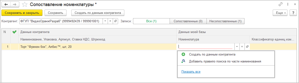 ■ Если же требуется сопоставление номенклатуры, то после сопоставления необходимо выполнить команду создания, документ будет создан согласно заполненным правилам.