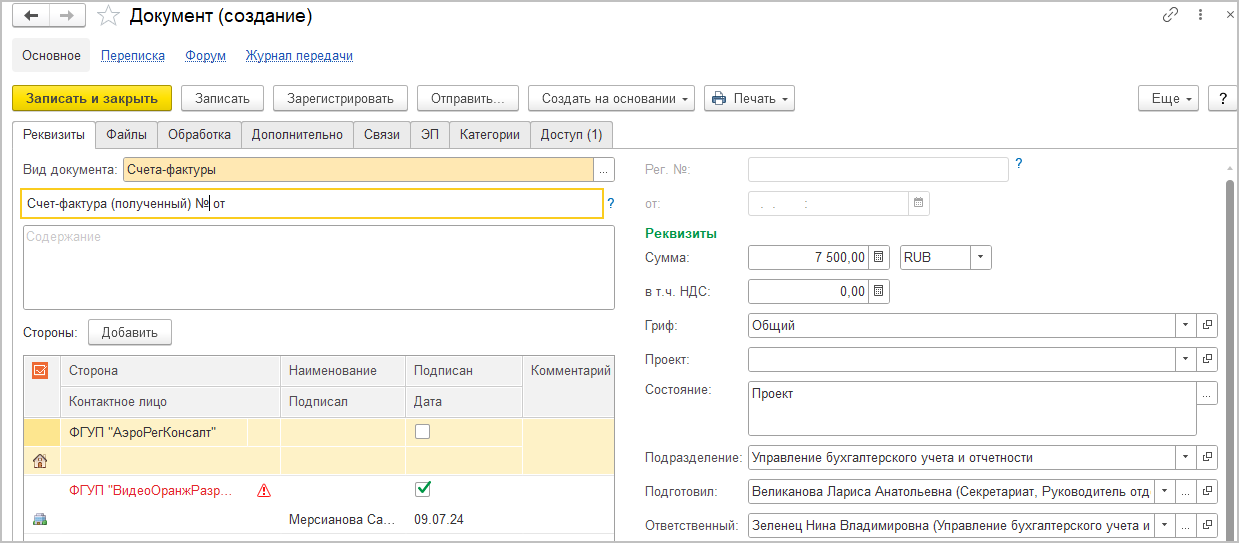 После выбора шаблона откроется незаписанная карточка документа, с предложением заполнить необходимые реквизиты.