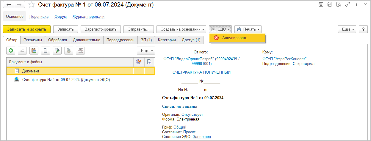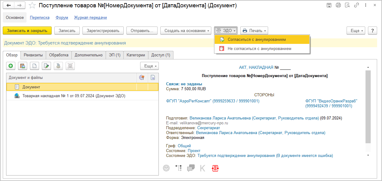 Если в документе ЭДО выявлена ошибка, то можно предложить контрагенту аннулировать документ. Соответствующая команда предусмотрена в карточках документа ЭДО и документа 1С:Документооборота.
