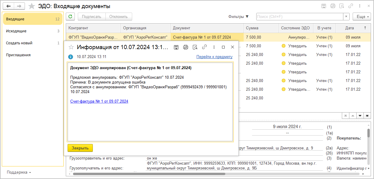 Если контрагент примет аннулирование документа, то ответственному за документ придет уведомление о его аннулировании.