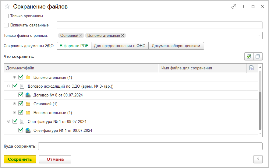 В списке документов при выполнении команды сохранения файлов документов 1С:Документооборота (Еще – Сервис – Сохранить файлы...) доступно и сохранение связанных с ним документов ЭДО.