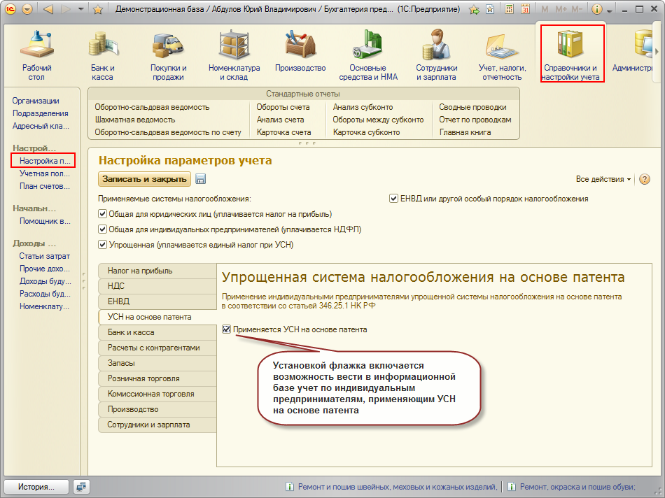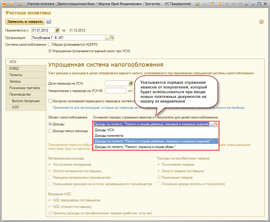 Закладка "УСН"